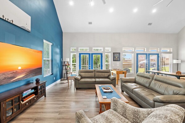 The living/great room has 2 giant ceiling fans. There you will find a 75 in Smart HDTV. When the sun goes down, the living area can become a movie theater. We love watching Star Wars movies and eating popcorn out there when it is not occupied.