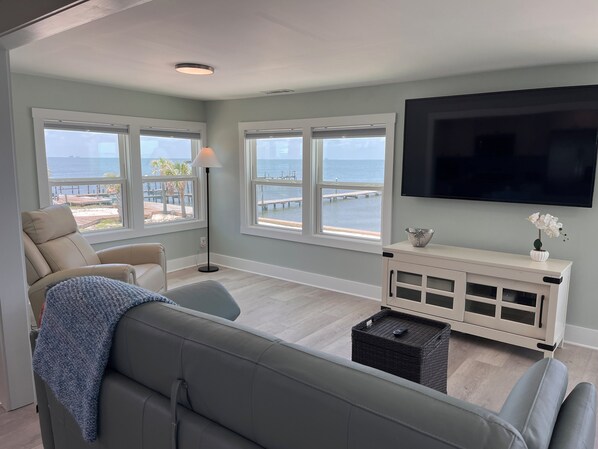 Spacious living room with leather sofa, two power recliners, large flat-screen TV, and sweeping bay views