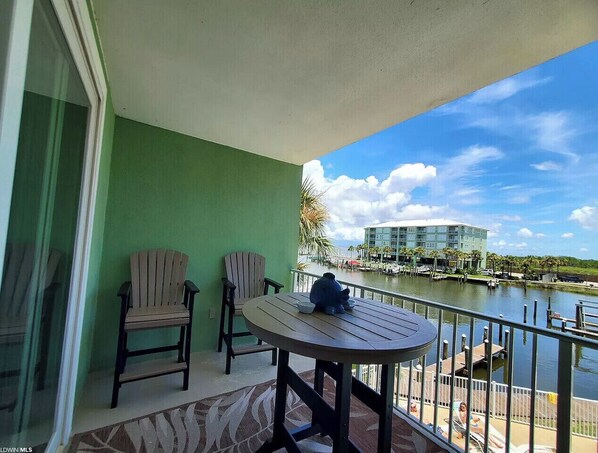 Coffee? Dinner or breakfast ? Table for four on your private balcony with views of Mobile Bay. The luxe Navy Cove community also offers one unheated pool with a hot tub attached. A fish-cleaning station and a barbecue area with a charcoal grill make it easy to cook up your catch-of-the-day.