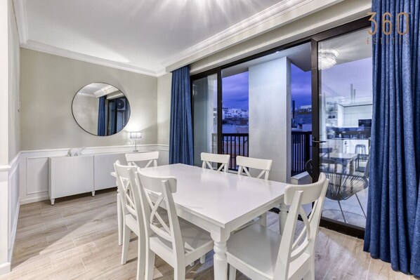 The interior of the apartment is thoughtfully designed, with a spacious dining area, a living area equipped with a Smart-TV & let`s not forget the fully equipped kitchen, complete with all the appliances & utensils you need to whip up a delicious meal making it perfect for any length of stay !