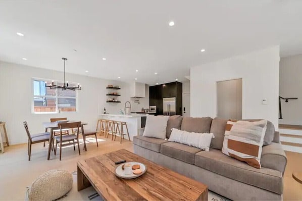 The dining area comfortably seats 4 guests with 4 additional seats at the kitchen bar. The kitchen boasts brand new, stainless steel appliances (including a drawer microwave, 6-burner gas stove, pot filler kitchen faucet, and dishwasher) and everything guests might need to whip up their favorite meals.