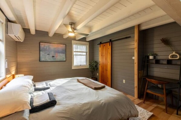 Comfortable & cozy master suite outfitted with clean sheets, a small work desk, and a full bathroom equipped with a spa-like shower.