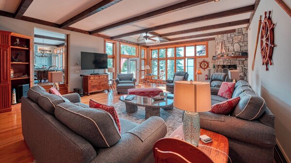 Vanta 9.500 piedi quadrati di spazio vitale incredibile, 440 piedi di lungomare e 12 acri di giardini, prati e boschi professionali. All'interno, ampie camere, alti soffitti, luci del cielo e viste sull'acqua aperta danno una sensazione maestosa. Vi è ampio spazio per famiglie numerose e gruppi per rilassarsi, riunirsi e intrattenere.