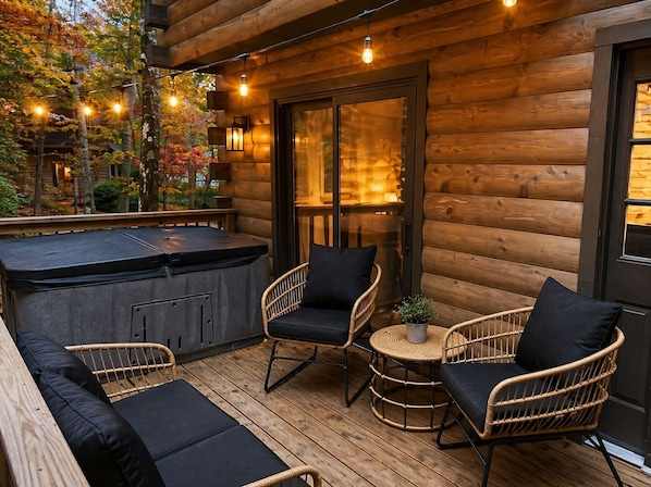 *Private back patio with hot tub, propane grill, fire pit, outdoor seating and private wooded area behind house where wildlife abound