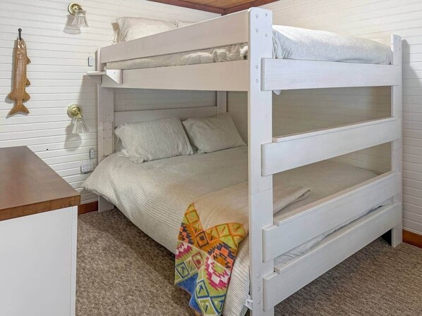 The Bunk Room: No flimsy twin bunks here. These are heavy-duty Queen-over-Queen adult bunks (rated to 800 lbs). We used the same top-tier mattresses and linens on these as we did the King. Even in the "bunk room," you’re sleeping like royalty.