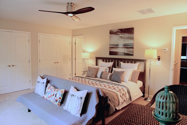 Il secondo piano ha 2 ampie camere da letto con tutti i nuovi letti king size, materassi, trapunte, 100% cotone, lenzuola e asciugamani anallergici di alta qualità, ventilatori a soffitto con luce e telecomandi, tavolo + sedia, lampade e sveglie da comodino con porta di ricarica USB. La camera da letto principale si apre su un balcone privato con posti a sedere privati per 2. Il bagno principale ha una grande vasca tradizionale con doccia e il secondo bagno ha un box doccia in vetro con un arredamento moderno di latta per la pioggia. La camera da letto principale ha una smart TV abilitata a Internet (senza cavo) per la visione privata per offrirti un'esperienza completa di disconnessione e spegnimento.