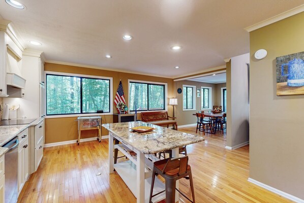 While dinner simmers, perch at the island bar with seating for four. Gather for fresh cuisine around the six-person dining table.