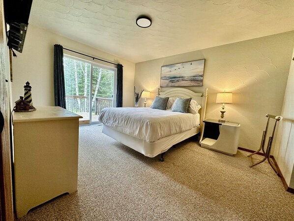 The main level includes a cozy queen bedroom with an attached private bath and its own walkout porch; perfect for morning coffee or quiet evenings by the water. Upstairs, the large primary bedroom includes a king bed and a twin trundle, while the third bedroom features another queen bed. A second full bathroom is also located upstairs.