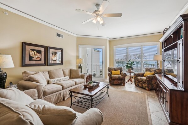 Questo condominio con vista sull'oceano Palmetto Dunes di 2 camere da letto è arredato con gusto e situato al 4 ° piano. L'ampio soggiorno si ha pavimenti in cotto e un sacco di comodi posti a sedere per rilassarsi dopo una giornata in spiaggia. C'è un grande televisore a schermo piatto, un divanetto, divano e due poltrone. Una grande finestra offre una splendida vista dell'Atlantico, e le porte scorrevoli in vetro conducono alla zona balcone con 4 sedie e un tavolino.