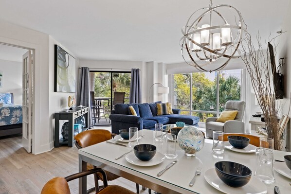 is spacious and offers floor to ceiling window views, all new furniture, flat screen smart TV, plus access to a covered balcony with a table and chairs for outdoor views of the ocean.