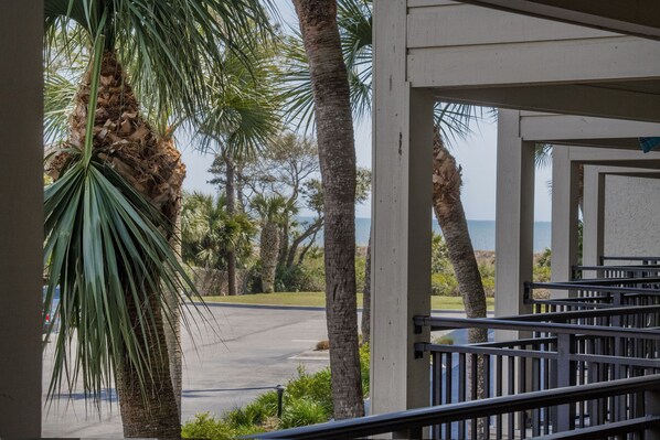 This specific unit is recently updated, modern, and very cozy. The owners have outfitted the kitchenette with everything you could want. There is a generous supply of board games. The furnishings are nice. The beach chairs, wagon, and bicycles are all clean and well kept. Their attention to detail is noticeable. The property is just off the central area of Coligny Beach. All conveniences are within a few minutes walk/drive. You can see the ocean if you lean out from the balcony. I don't consider that ocean view. The pool is within the confines of the structures. It does not have an ocean view.