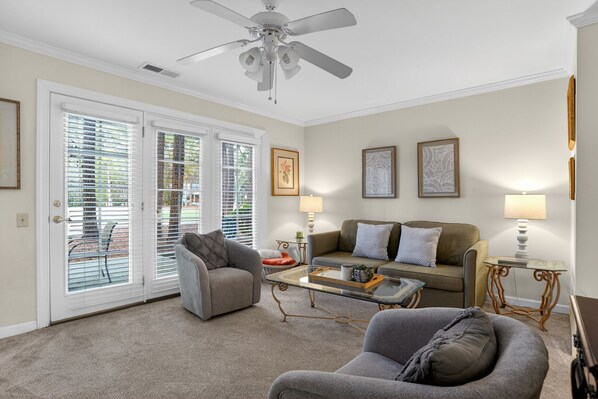 We had planned to stay two weeks, but added a third. So in all we became accustomed to the unit and just shrugged - “it is what it is”. It feels like your grandmothers house - comfy but outdated. The location and amenities were great and the end unit spacious and looking over the golf course. That said, the unit itself needs some upgrades. The kitchen was poorly equipped , with various things broken, or just non-functional (door handle on 1980’s fridge kept falling off, the burners on the oven are uneven and one of the elements on the old electric oven sparked In a flame and turned off the circuit (scary!), there were only 2 drinking glasses one of which broke quickly but plenty of wine glasses. No utility knives but a dozen steak knives. Other issues: patio a screen door wasn’t working but prop mgmt fixed right away; the patio has a round table but no chairs to sit around it; no bbq; when we arrived the house had a bad smell of must and urine (pet?) - we bought scented candles and opened all the windows; the closet in primary bedroom is full of items making it difficult to hang clothes; the washroom tap handle keep falling off, no stereo but an old portable which didn’t work: tv ancient - no Netflix etc, washer/dryer sticking out into the hallway; and we couldn’t get the fireplace to work. I think the rental price reflects some of this, but if you are looking for contemporary, designer accoms this won’t be for you.