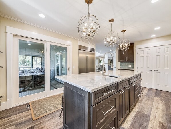 Entrando nell'atrio della casa, i soffitti a volta e le luci del cielo lasciano entrare molta luce e calore! All'immediata destra è la master suite / bagno che ha 2 pareti di finestre, ancora una volta che permettono un sacco di sole, ma hanno sfumature scurite per una notte di sonno dopo le vostre giornate di divertimento al sole!