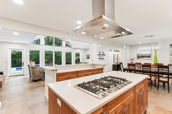 La grande, cucina gourmet è completamente attrezzata e dispone di un isola con un piano cottura a gas e elettrodomestici in acciaio inossidabile. C'è un mezzo bagno fuori dalla cucina. Il tavolo da pranzo ha un sacco di posti a sedere per riunioni di famiglia, nonché una comoda sit-in finestra a bovindo.