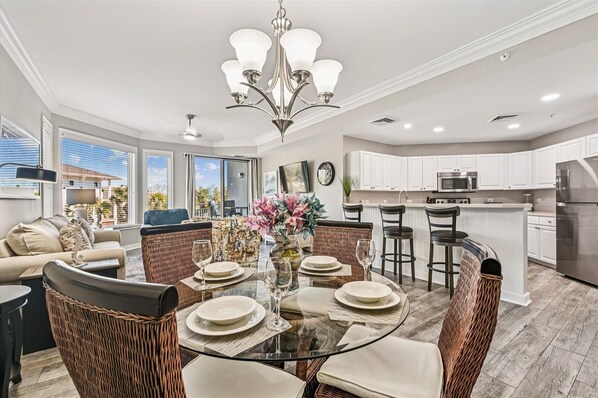 The fully stocked kitchen is equipped with stainless steel appliances, a glass-top stove, and a dishwasher. A washer and dryer are neatly tucked away behind pantry-style doors. Guests can enjoy casual meals or morning coffee at the counter with four bar stools, while the round glass dining table comfortably seats four.