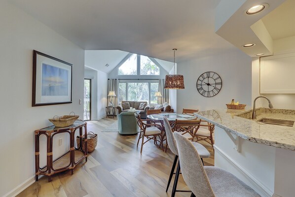The open-concept floor plan features a living area with a queen sleeper sofa, large Smart TV and access to the private balcony overlooking the lagoon and golf course. The dining area seats 5 comfortably with additional seating for 2 at the kitchen bar.