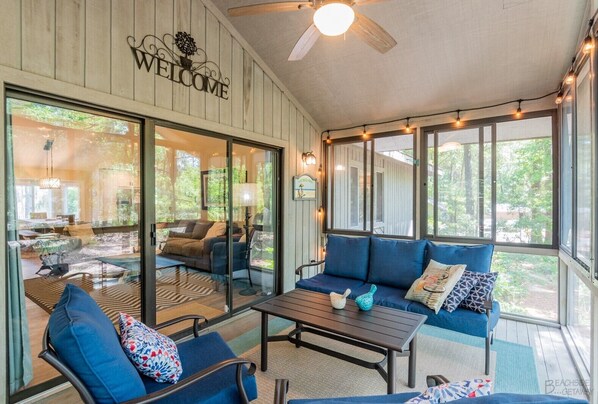 One notable feature of this vacation home is the Carolina room, accessible from the living room. This additional space offers a tranquil retreat, flooded with natural light, making it an ideal spot for enjoying a morning coffee or a good book.