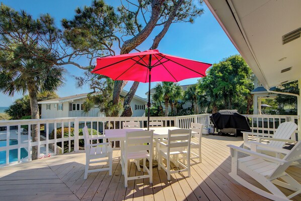 Al piano superiore è il piano principale della casa. La cucina è ben attrezzata con un ampio spazio armadio e mangiare nel bar per la colazione. La sala da pranzo ha 8 posti a sedere e si trova in posizione centrale in modo che tutti possano gustare i pasti insieme. Il soggiorno dispone di una grande TV a schermo piatto e vista sull'oceano. Appena fuori dal soggiorno sono le camere da letto. La prima camera degli ospiti dispone di un letto matrimoniale e condivide un bagno con il corridoio. La prossima è la camera da letto matrimoniale con letto singolo aggiuntivo, bagno privato e schermo piatto. Dall'altro lato del soggiorno si trova la camera da letto principale e il bagno con un letto king size, una TV a schermo piatto e l'accesso al ponte posteriore. Il ponte posteriore ha posti a sedere ampi e si affaccia sul ponte della piscina appena intonacato e nuovissimo. Goditi i pasti all'aperto con la griglia a carbone. In piscina ci sono molti posti dove prendere il sole tra cui una terrazza privata e accesso alla spiaggia.