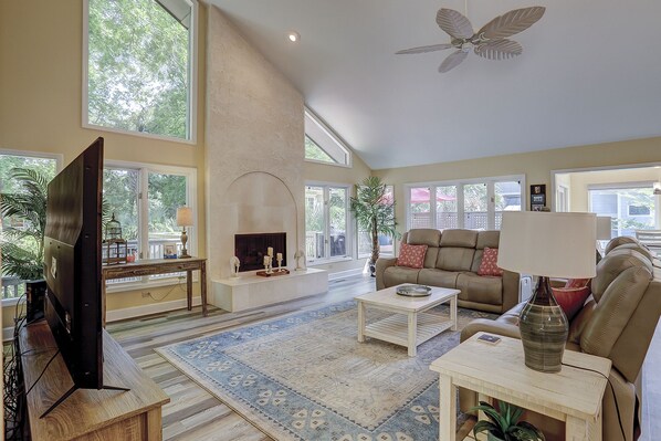 The 14-foot ceiling keeps the space open as the kitchen opens to the spacious living room and dining area of the light and bright home. Upstairs and downstairs master suites with tubs and walk-in showers are perfect for multiple families to enjoy. With 3 miles of white sandy beaches only steps away, this fantastic Hilton Head home is the ideal getaway for family and friends.