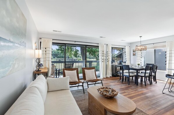 To the right of the entrance is the open floor plan with kitchen, dining room and living room. The fully equipped kitchen has white granite countertops and stainless-steel appliances. There are three stools at the countertop and additional seating for six at the adjacent dining room table. Inside the kitchen closet is the new washer and dryer. As a bonus, in the corner of the dining room is a cute coffee station. The living room has a comfortable, white sofa, two chairs, a desk and chair and a 50” TV. The sliding doors open to a covered deck overlooking the golf course. It has a high-top table for four plus two additional chairs. This is a great place to have your morning coffee or evening cocktail while watching golfers pass by.