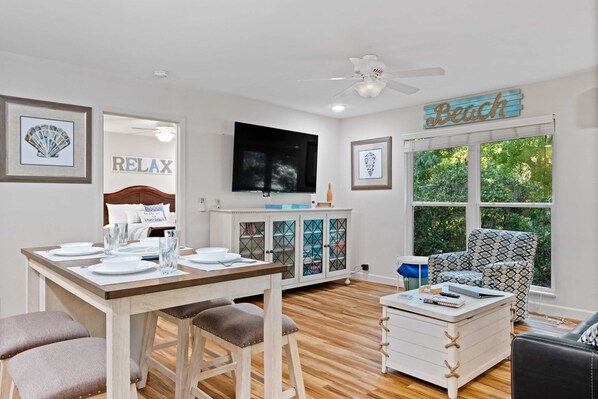 Beautifully decorated with a coastal theme, and equipped with a comfy leather couch, easy chair, and a 65” Roku TV.