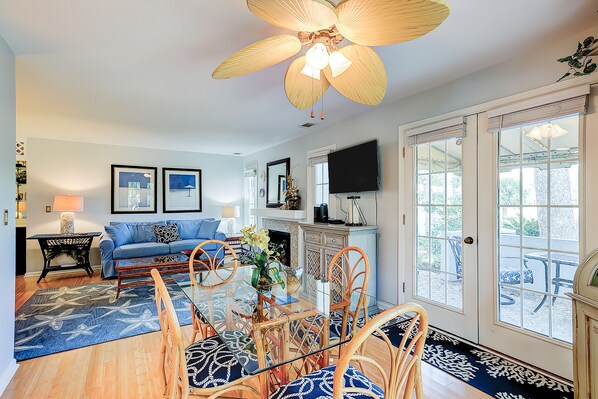 At the home itself, you'll find convenient ground-floor living and a fully renovated space featuring light, beachy decor. The kitchen is a cook's dream, with a full suite of stainless steel appliances and lots of counter space for prep. The whole family can grab a bite at the kitchen table or sit down for more formal meals in the adjacent dining area. Mix up a cocktail at the wet bar and spend evenings streaming the latest release or uploading the day's pics to social media. Even better, unplug entirely and step back out to your patio for a nighttime toast to booking such a sweet Hilton Head escape.