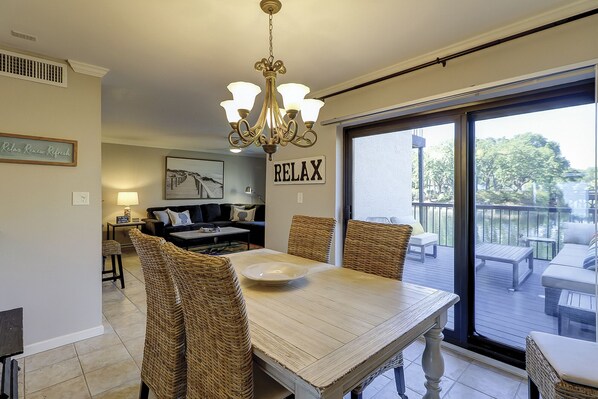 New to the vacation rental market for spring 2023, this beautifully updated 1 bedroom, 1.5 bath end Hilton Head Island Club unit offers guests an open-concept floor plan, wraparound decks and brand new furnishings.