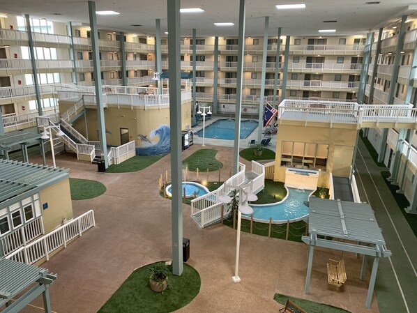 We are located in building 3 of the Hilton Head Resort and our front porch overlooks the indoor pool, kiddie pool, hot tub, workout center, sauna, and indoor track.