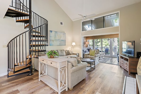 There are two bedrooms on the main level. The first is the main bedroom with a king bed, tv, lagoon views and a large private bath with a walk in shower. The second bedroom has a queen bed and a twin bed with a tv, slider to the front porch and shares the hall bathroom. The spiral staircase leads you to a queen bedroom and a bedroom with two double beds. Both bedrooms have a tv and share the hall bathroom.