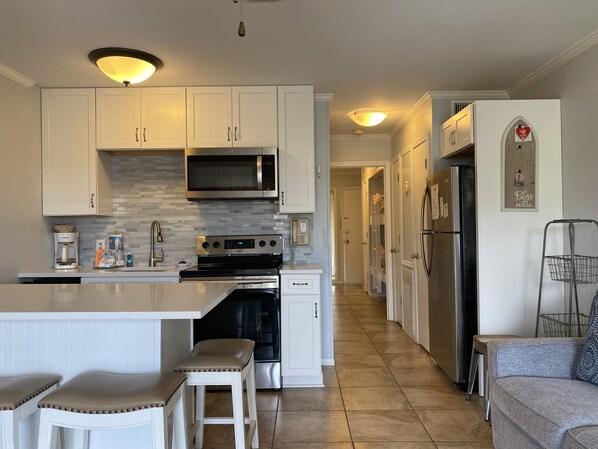 This beautiful one-bedroom villa has been recently updated and sleeps up to 5 people. The living room area includes a sleeper sofa and a big screen TV, The kitchen features updated countertops/cabinetry, stainless steel appliances, and a gorgeous backsplash, along with a massive island that has dining stools to enjoy all your meals. The bedroom is furnished with a queen bed. Right outside the bedroom are two captain's bunks perfect for kids. Enjoy your own balcony or take a short walk to the beach/pool.