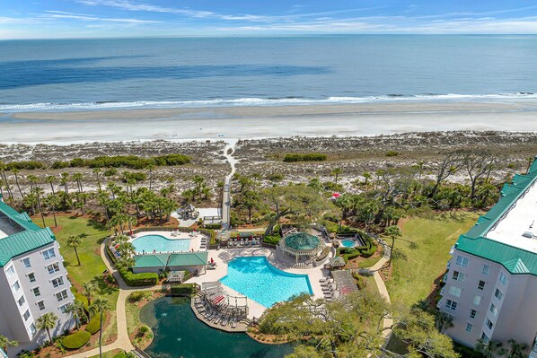 Beach Boardwalk, playground, and 2 outdoor swimming pools & hot tub