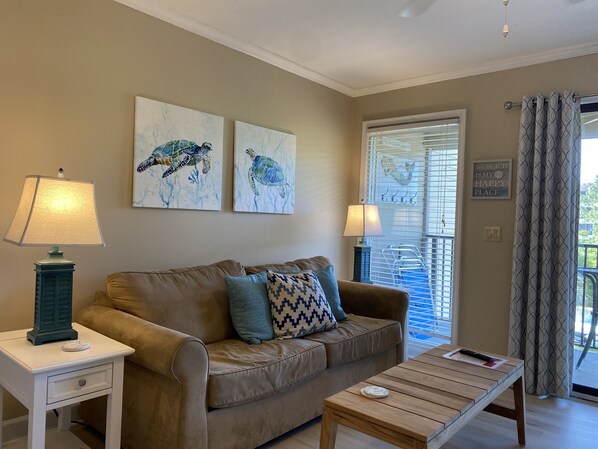 This beautiful upgraded one-bedroom villa is in the Ocean Villas. There is a fully equipped kitchen, dining area/living area with a queen sleeper sofa in the living room. The bedroom is furnished with a king bed. You have your own balcony to enjoy or you can take a short walk to the beach.