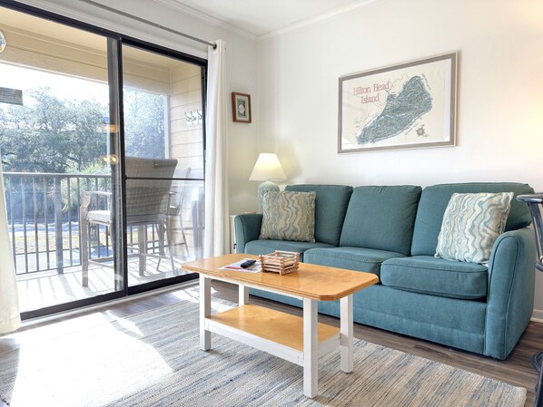 This beautiful one bedroom one-bathroom villa is located on the first floor of Ocean Villa A building. There is a fully equipped kitchen and eat in dining area. The master bedroom is furnished with a queen size bed. There are a set of captain's bunks located in the hallway - perfect for young children! The living area includes a queen size sleeper sofa. Enjoy the salt air right from the furnished balcony or take a short walk to the beach, pools, or courts!