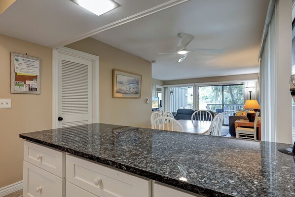 La piantagione comprende chilometri di sentieri per escursioni a piedi e piste di moto HHI estese, 11 miglia di lagune per il canottaggio e il kayak e molti ristoranti dell'isola. Il porto di Shelter Cove è a un chilometro di distanza e comprende negozi, ristoranti e fuochi d'artificio in estate. Il libero Palmetto Dunes Buggy può portarti a questi luoghi, semplicemente chiamarli.