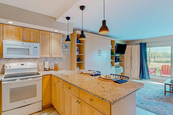 Upon entering Bluff Villa 1799, you will discover an air-conditioned open floor plan with a Murphy bed that folds into the wall. The living area enjoys a smart TV with streaming services. Through the sliding doors, enjoy the private patio area, with a patio table and chairs, water views, and a gas grill. The well-appointed kitchen has all the major appliances needed to prepare delicious homemade meals. The bathroom boasts pristine renovations from 2023. In addition, you will find a stacked washer/dryer.