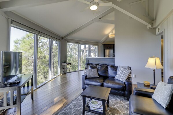 NUOVA FESTA DELL'ISOLA! Questo cottage è una proprietà unica ha una vista spettacolare del Calibogue Cay e si trova a pochi passi da negozi e ristoranti di Harbourtown. Dieci passi ti portano al primo piano di livello dove troverai una zona pranzo all'aperto con un grill a gas. Dieci altri passi ti portano al ponte di secondo livello con un tavolo in stile caffetteria per due e l'ingresso di questa proprietà modernamente decorata. Completamente rinnovato con tutte le amenità che speri di trovare nella tua vacanza, questa villa con 2 camere da letto e 2 bagni delizierà i tuoi sensi con vista a 360 gradi sull'acqua e sul bellissimo fogliame indigeno di Hilton Head Island e South Carolina. Goditi una tazza di caffè o un cocktail serale dal ponte, dal soggiorno o dalla cucina mentre guardi barche, kayak e paddle boarder salpare su The Cay. La zona giorno ha divani in pelle con una grande TV a schermo piatto e una cucina abitabile completa di elettrodomestici in acciaio inossidabile, ripiani in pietra e armadi ben forniti per quattro. La camera da letto principale ha un letto matrimoniale con TV a schermo piatto e bagno privato con cabina doccia. La camera degli ospiti ha due letti singoli e una TV a schermo piatto che utilizza il bagno sala con una cabina doccia, pure. Ogni camera da letto ha sfumature di nero, così il sonno sarà facile in queste camere accoglienti. La zona giorno ha sfumature di privacy che non ostruiranno la vista dall'interno, ma manterranno le cose private quando lo si desidera.
