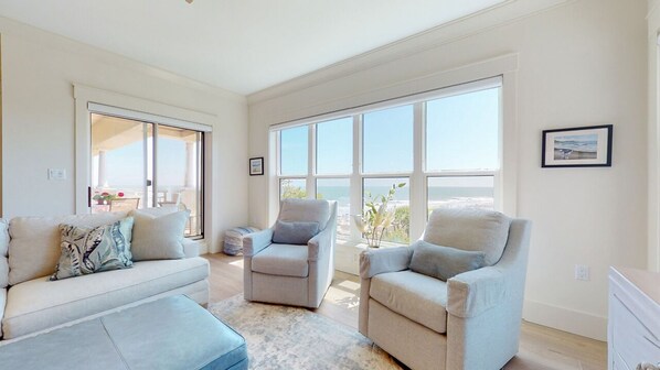 The living room has balcony access and is beautifully furnished in coastal contemporary style with plenty of comfortable seating and a 65” smart TV. The two swivel chairs are a perfect spot to enjoy the beautiful beach and ocean views.