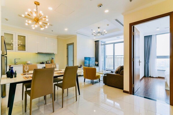 The property is spacious and comfortable for party of 4. Some of the living room furniture can be updated but it did include basic amenities. The distance is about a 15-20 drive from the Saigon market which cost on average 80000-115000 dong depending on time/traffic. I thought it was located in the Landmark 81 building but it was in an adjacent Landmark Plus building on the 33rd floor. It did have a nice view of the city. If you are looking for a long term stay and want to cook, this place would be perfect. However, if you are only looking to stay in Saigon for a few days, I would recommend staying closer to the city. The air conditioning units are operated by remote in each room. We did have issues trying to watch television as it wasn’t connected. Overall, by Vietnamese standards, we enjoyed our experience and stay.
