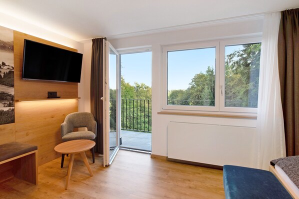 The accommodation has a master bedroom with TV and balcony, another small bedroom with two beds and skylight. The smaller bedroom is well suited for children. A spacious bathroom with shower, a separate well-equipped kitchen and a small dining area. Since we are in a rural structurally weak region and the expansion of broadband and fiber is slow, the internet is slow.