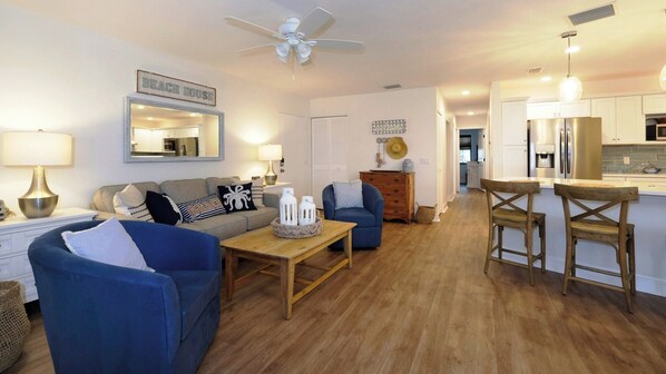 L'Unità 22 è stata amorevolmente ristrutturata da nuovi proprietari con l'obiettivo di creare un'esperienza da spiaggia perfetta per i loro ospiti. La cucina, il soggiorno e la sala da pranzo sono aperti e invitanti, con splendidi controsoffitti in quarzo bianco, elettrodomestici in acciaio, arredi da spiaggia e un grande bar per la colazione perfetto per visitare con la famiglia. La grande smart TV può essere visualizzata da qualsiasi parte della stanza.