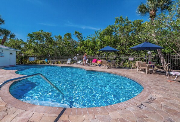 The screened-in lanai overlooking the pool and natural mangrove preserve is the perfect spot for morning coffee or evening cocktails. With a king master bedroom and an additional guest room with 2 full-size beds there is plenty of room for the family. This condo also features an indoor or outdoor dining table for 4 as well as a cute breakfast bar.