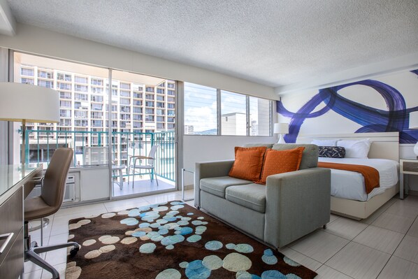 Aqua Aloha Surf Waikiki #1008 Deluxe Studio with Lanai and Partial City Views located just 2 Blocks to Waikiki Beach, (1) King bed + (1) Twin sofa sleeper, Sleeps 3. 360 Sq Ft.