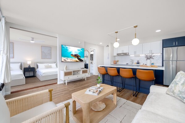 Step inside and unwind in a cozy, thoughtfully designed space with sweeping views of Diamond Head, the sparkling city lights, and a glimpse of the ocean from your private lanai. The bedroom features both a queen-size and a full-size bed, along with a 50" Smart TV, while the living room offers a pull-out sleeper sofa and a 65" Smart TV—ideal for unwinding after a day of adventure. The condo also includes a fully equipped kitchen, a dining bar with 4 bar chairs, and a full bathroom with a tub/shower combo—everything you need for a seamless and comfortable stay.