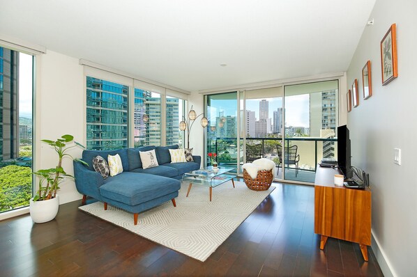 Experience luxury Waikiki living at its finest! This 2-bedroom, 2-bath condominium with high-end touches throughout features floor-to-ceiling windows with panoramic Waikiki city views. Relax on your private lanai while basking in the cool Hawaiian trade winds. With a full gourmet kitchen, convenient in-unit washer/dryer, free Wi-Fi, central AC, and free parking, you'll have everything you need for a relaxing Hawaiian getaway!