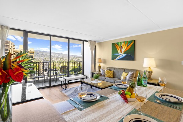 Experience paradise in this renovated 1-bedroom condo at the family-friendly Waikiki Banyan (Tower 2). Perfect for up to 4 guests, this 12th-floor retreat offers mountain and city views from the living room, bedroom, and a private lanai. This unit has a total area of 600 sq ft. Enjoy an open layout, air conditioning, a fully equipped kitchen, queen and full beds, a sleeper sofa, a 55" TV, a modern bathroom, free WiFi, parking, and convenient on-floor laundry. Just a short walk to Waikiki Beach, shops, and dining!