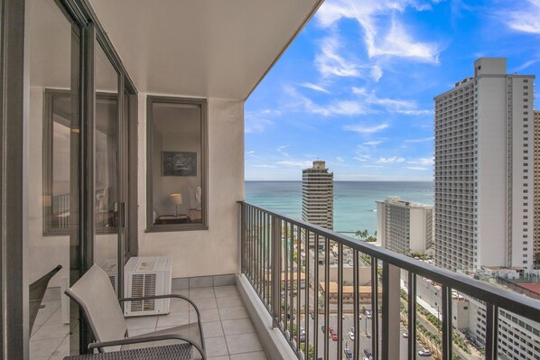 This 25th floor condo has the best of both worlds, a birds-eye view of the bustling city and sparkling ocean. Better yet, is only a 5 minute walk from the World-Famous Waikiki beach! This condo comes with a fully equipped kitchen including a refrigerator, stove-range, dishwasher, microwave, coffee maker, and all the kitchen supplies you will need to have an at home cooking experience while you are on vacation. This kitchen includes a gorgeous breakfast bar complete with stools for the perfect quick meal fix! Please sit back and relax in the airy living area that includes a large flat screen TV and cozy couch. The lanai includes lounge chairs and side table so you can enjoy a warm cup of coffee and watch the island sunrise!