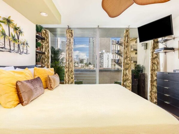 This tropical and warm green unit will ensure guests slumber soundly in their plush queen bed with bright pillows.