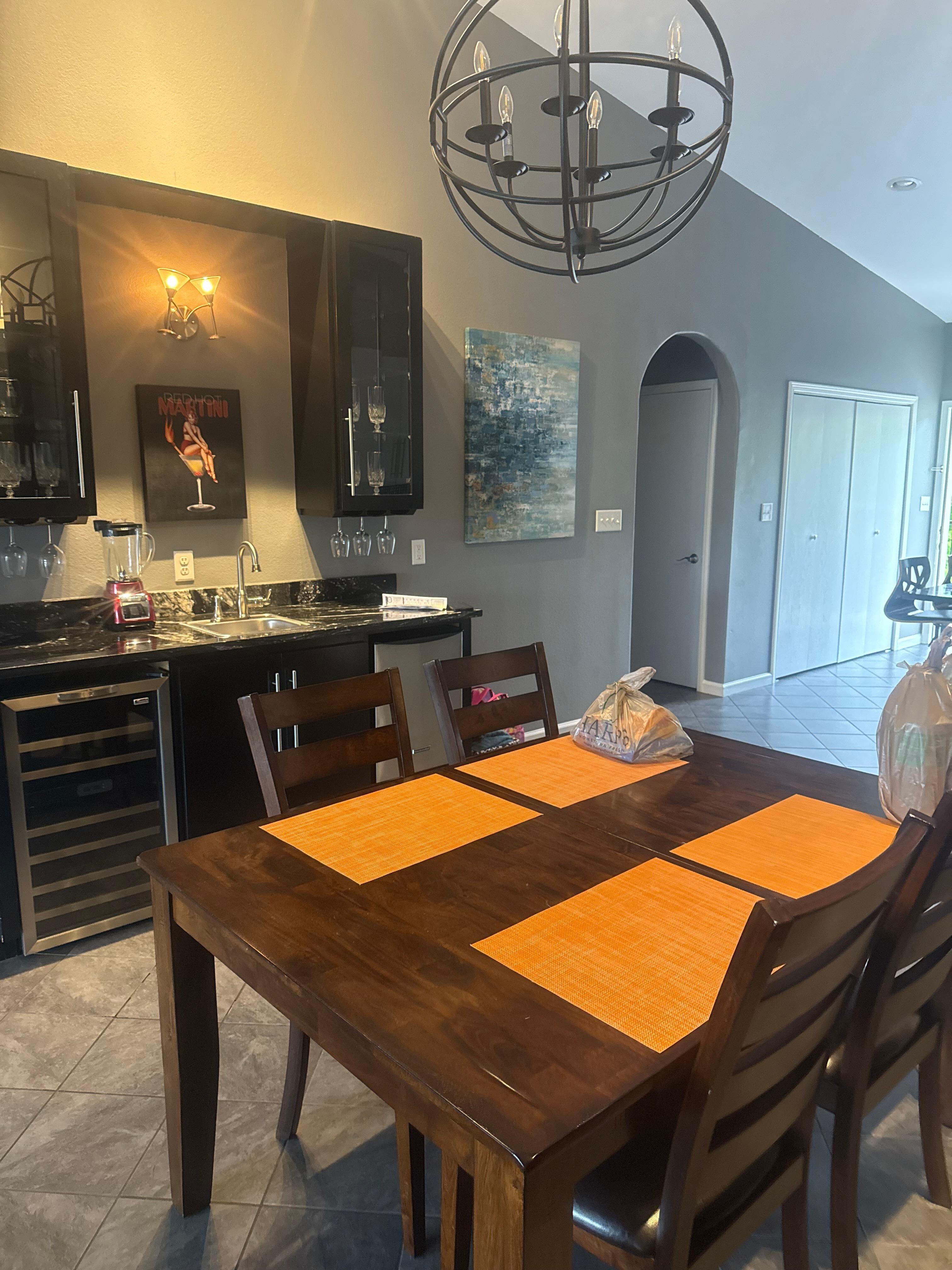 Goditi la nostra cucina completamente attrezzata con tutti gli utensili e le pentole necessarie per incanalare il tuo chef interiore durante il tuo soggiorno. La cucina contiene sia una caffettiera tradizionale che una caffettiera Keurig. L'enoteca presenta un frigorifero per il vino, una macchina per il ghiaccio tritato, bicchieri da vino e apri vino. Il tavolo della sala da pranzo può ospitare comodamente 4 persone, insieme a ulteriori posti a sedere nella zona dell'isola della cucina. Prenditi cura di tutto il bucato con la nostra lavatrice / asciugatrice, insieme a detersivo, fogli di asciugatrice, ecc. C'è anche un ferro da stiro, un asse da stiro e un portabagagli nell'armadio principale per la vostra comodità.