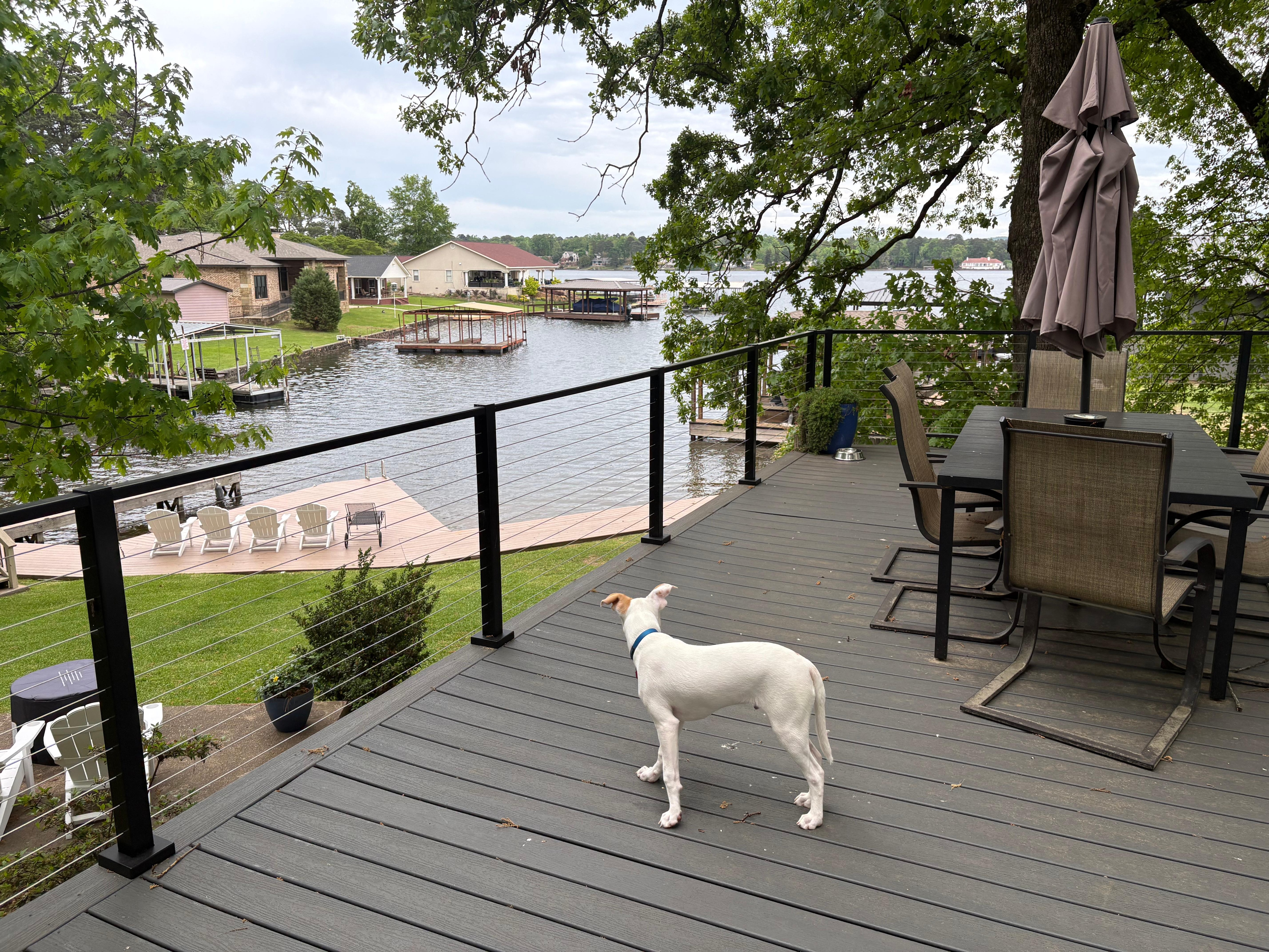 Abbiamo un tavolo con ombrellone insieme a una griglia barbecue a gas che si affaccia sul Lago di Hamilton.