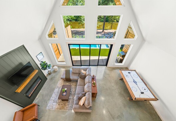 - Vaulted ceilings, tall windows, and a cozy electric fireplace